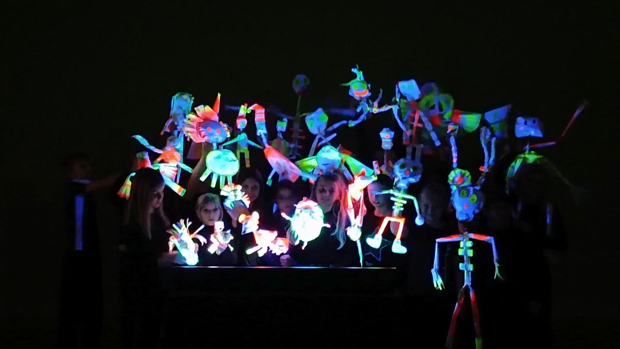Am zweiten Tag folgte ein kreativer Höhepunkt: ein Workshop, in dem die Schülerinnen und Schüler der 4. Klassen eigene Puppen gestalteten. Nach dem Basteln wurden die Figuren besprüht und anschließend unter Schwarzlicht bestrahlt, was einen großartigen Effekt hatte. Die leuchtenden Farben und die besondere Atmosphäre machten das Ergebnis zu etwas ganz Besonderem.